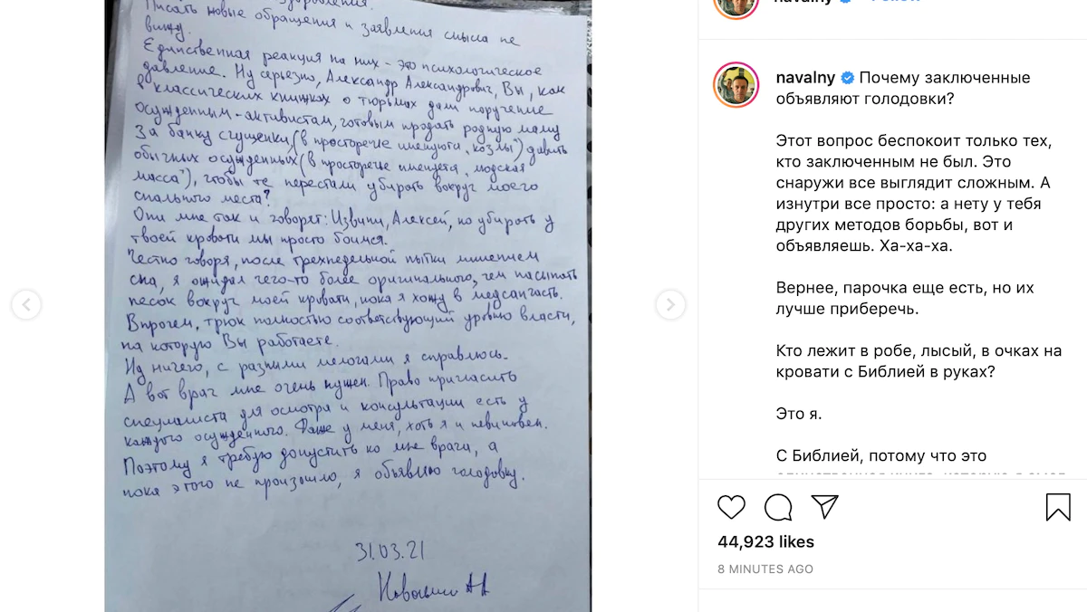 وكتب نافالني على صفحته بإنستغرام: "بدأت إضراباً عن الطعام للمطالبة باحترام القانون والسماح لطبيب من الخارج بزيارتي"، مضيفاً أنه بدلاً من تلقي العلاج كان يتم إخضاعه "للتعذيب بمنعه من النوم".