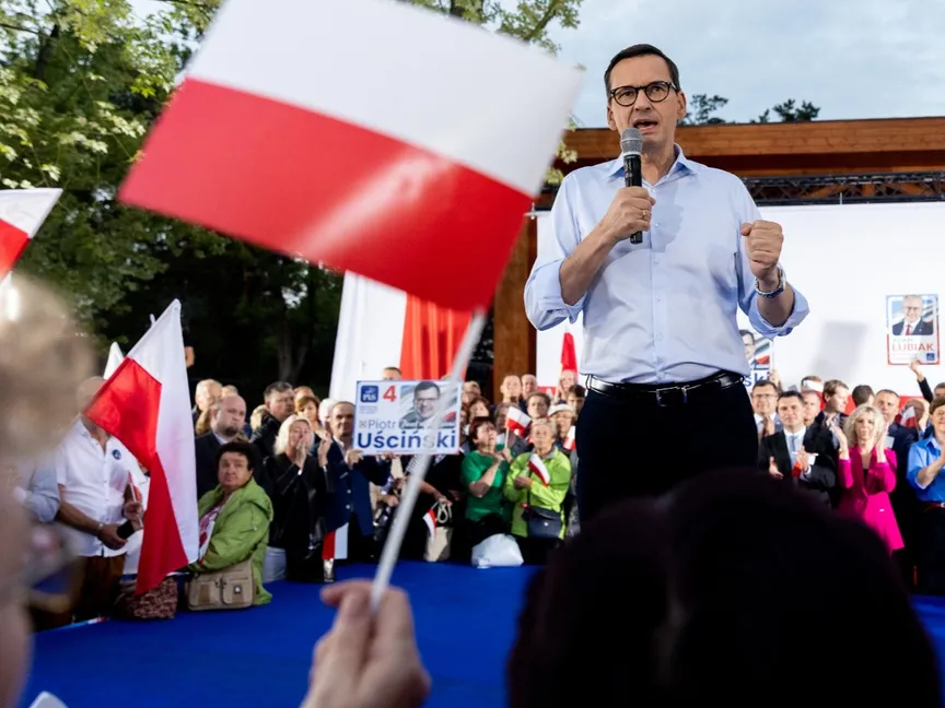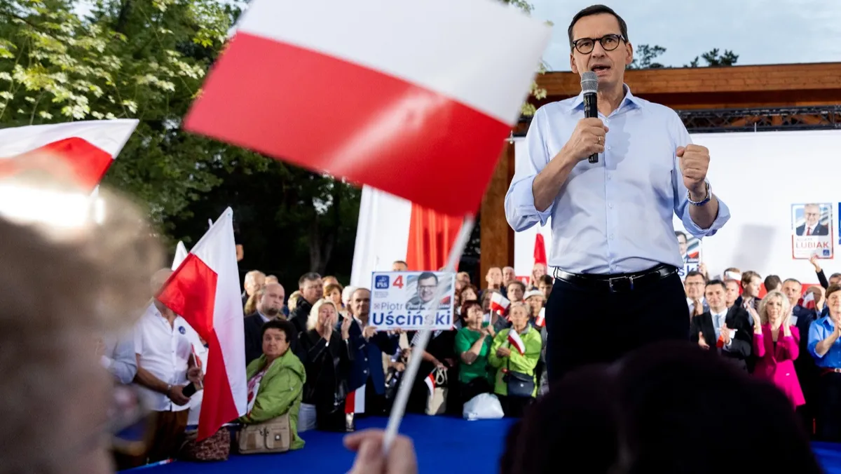 رئيس الوزراء البولندي ماتيوز مورافيكي خلال تجمع انتخابي لحزب "القانون والعدالة" قبيل الانتخابات البرلمانية في بولندا. 19 سبتمبر 2023 - AFP