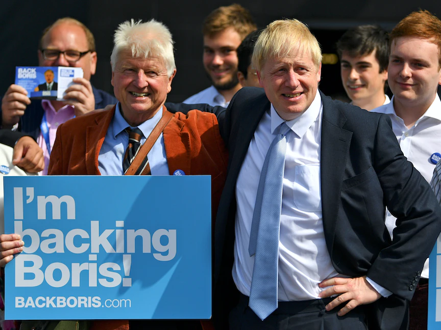 ستانلي جونسون وابنه بوريس الذي كان مرشح قيادة حزب المحافظين البريطاني- 28 يونيو 2019 - REUTERS