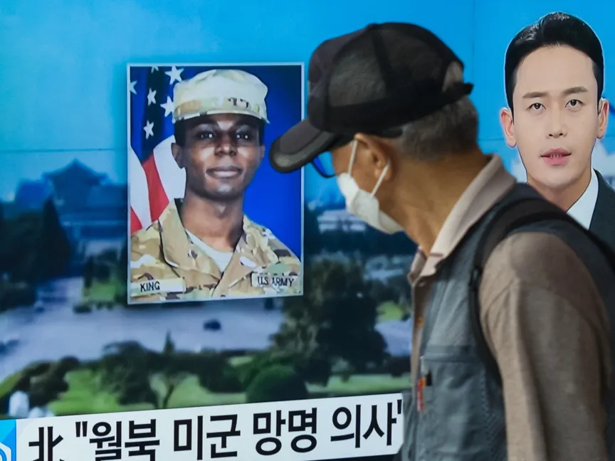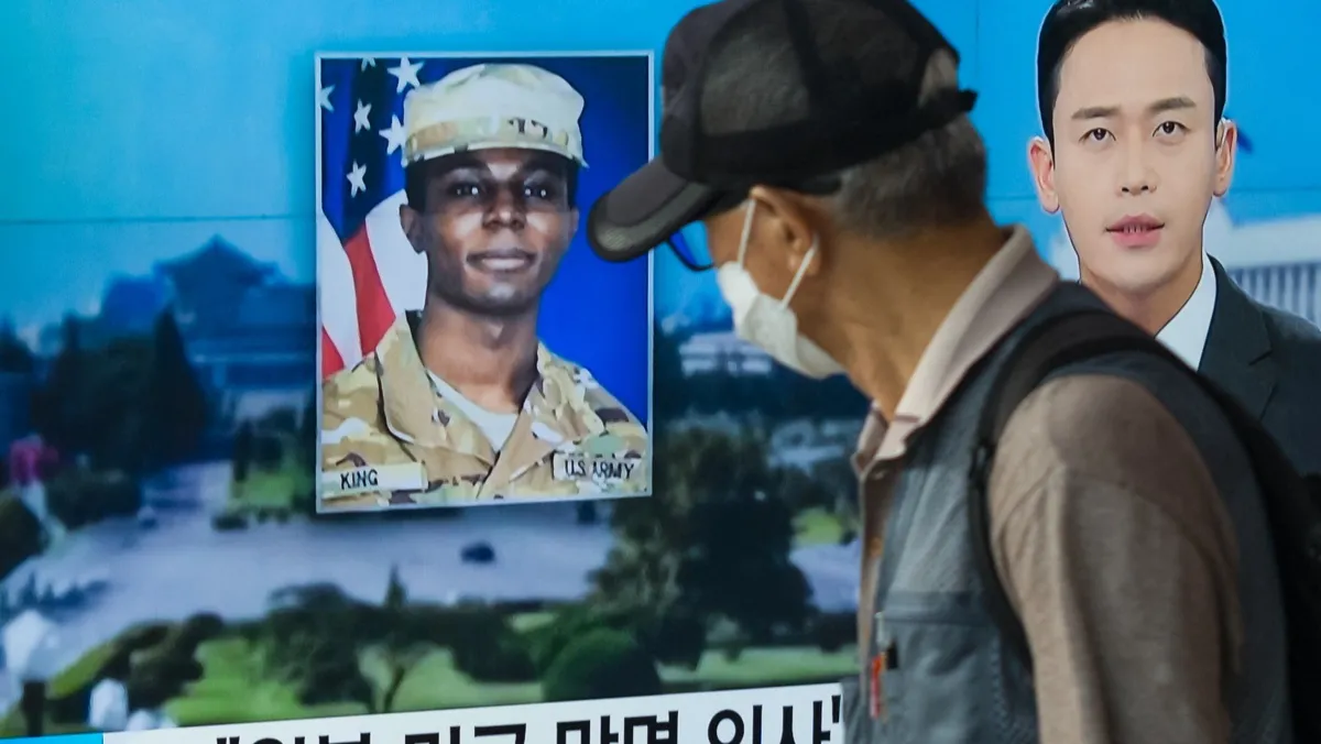 رجل يسير أمام شاشة تعرض صورة للجندي الأميركي ترافيس كينج الذي احتجز في كوريا الشمالية بعد عبوره إلى حدودها في يوليو الماضي- 16 أغسطس 2023 - AFP