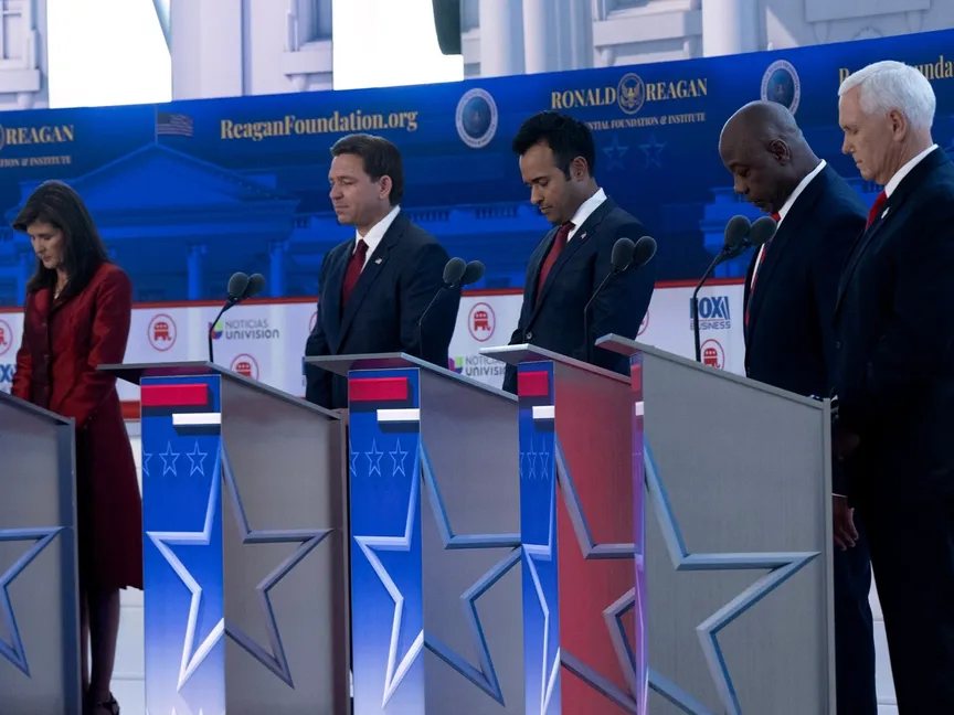 وأضاف: "هل تعلمون من هو الشخص الغائب الآخر؟ إنه دونالد ترمب الذي كان يجب أن يكون هنا على هذا المسرح الليلة، لأنه مدين لكم بالدفاع عن سجله". لكن حاكم فلوريدا تراجع بعد ذلك إلى حد كبير عن مواصلة استهداف الرئيس السابق، وأنهى حديثه بجملة قوية، قائلاً: "استطلاعات الرأي لا تنتخب الرؤساء، بل الناخبون هم مَن ينتخبونهم".