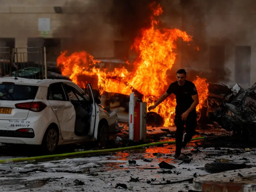 رجل يركض بعد اشتعال النيران في سيارة بعسقلان جنوب إسرائيل جرّاء صواريخ أطلقتها حركة "حماس" من قطاع غزة. 7 أكتوبر 2023 - Reuters