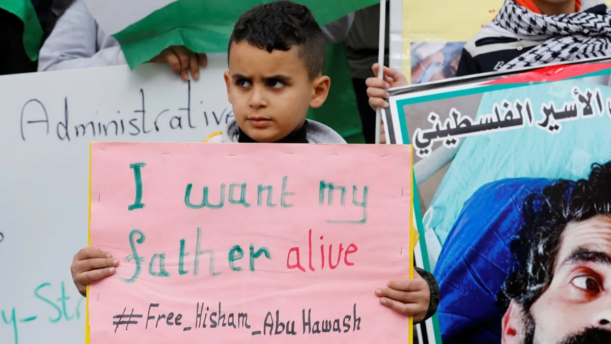 نجل الأسير الفلسطيني هشام أبي هواش خلال مظاهرة تضامنية بالضفة الغربية المحتلة مع والده المضرب عن الطعام في السجون الإسرائيلية. 2 يناير 2022 - Reuters
