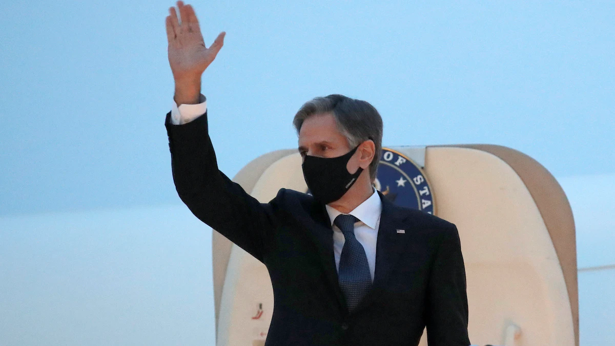وزير الخارجية الأمريكي أنتوني بلينكين يلوح بيده على سلم طائرة أميركية - REUTERS