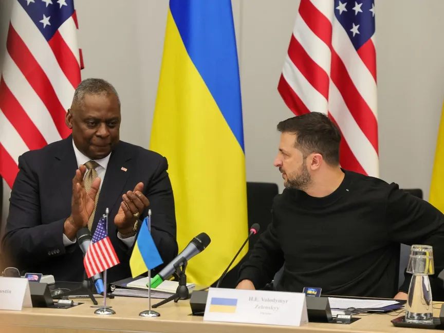 وزير الدفاع الأميركي لويد أوستن يصفق بعد أن تحدث الرئيس الأوكراني فولوديمير زيلينسكي خلال اجتماع لمجموعة الاتصال الدفاعية الأوكرانية ومجلس وزراء دفاع دول الناتو في مقر الحلف بالعاصمة البلجيكية بروكسل. 11 أكتوبر 2023 - Reuters