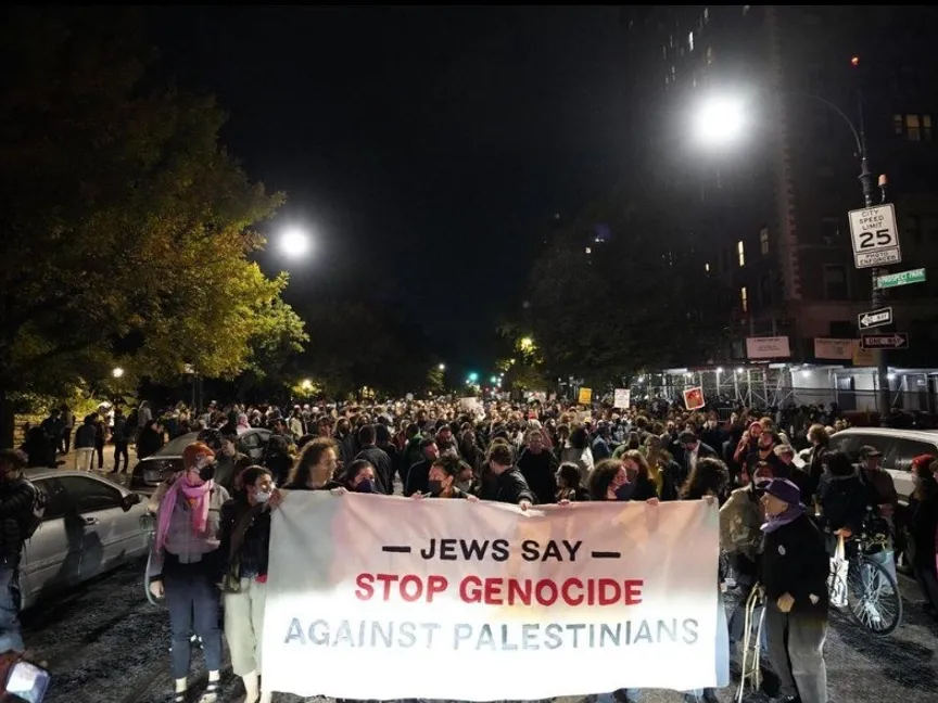 واحتشد المحتجون أمام منزل زعيم الأغلبية الديمقراطية بمجلس الشيوخ الأميركي، السيناتور اليهودي تشاك شومر، في بروكلين.