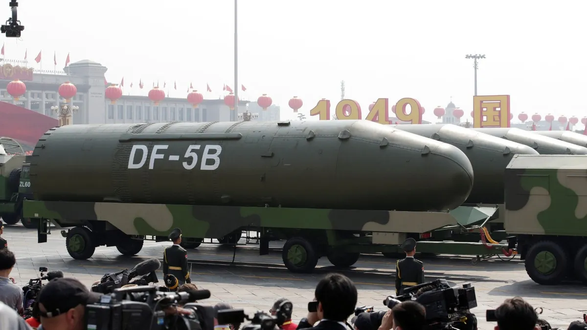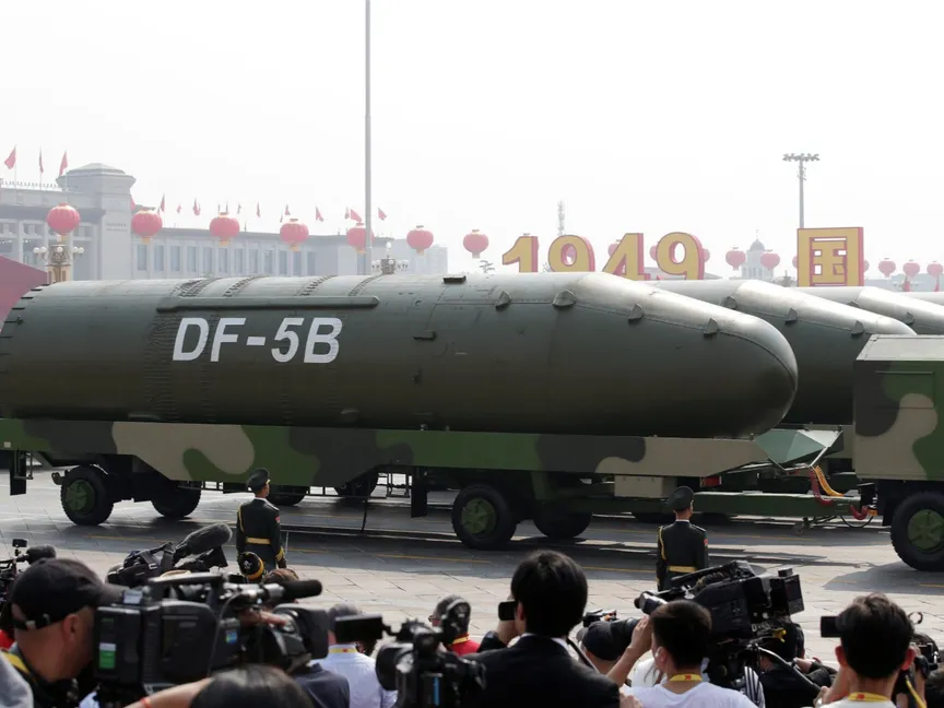مركبات عسكرية تحمل صواريخ باليستية عابرة للقارات من طراز DF-5B تمر عبر ميدان تيانانمن في بكين، الصين. 1 أكتوبر 2019 - REUTERS