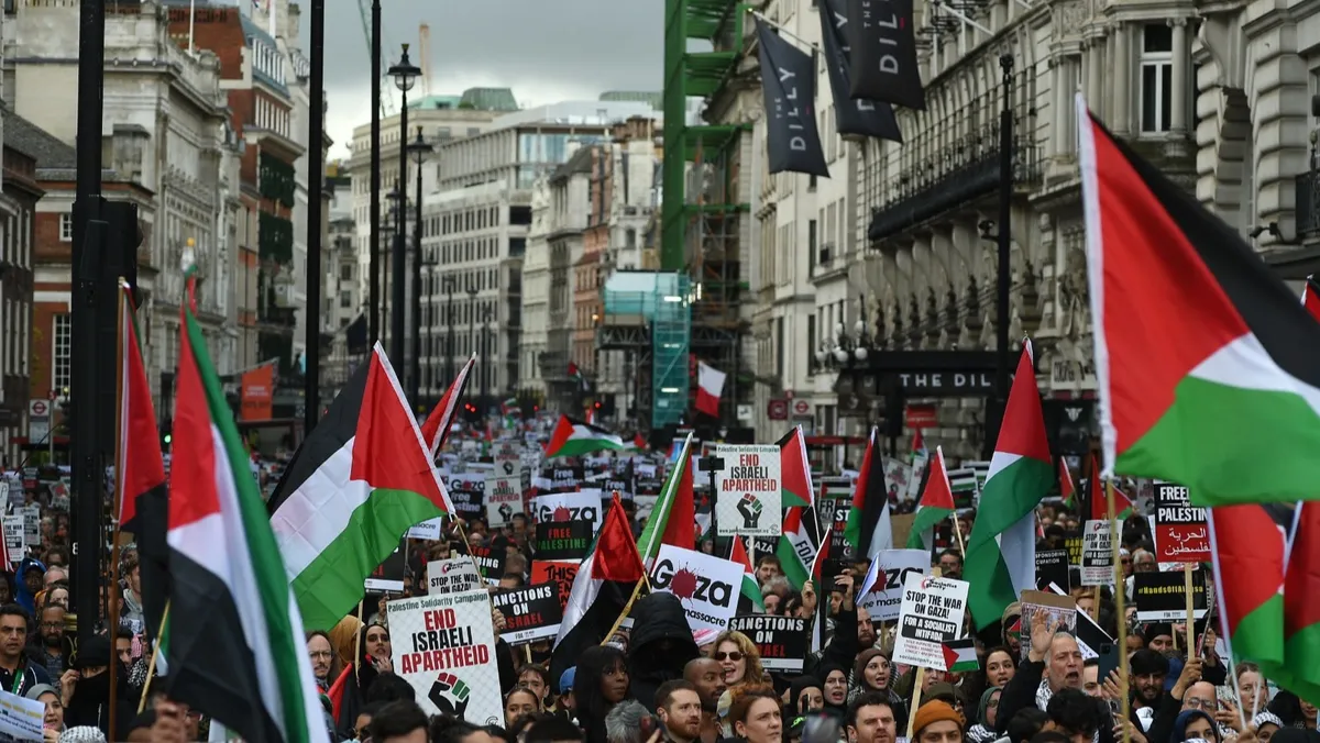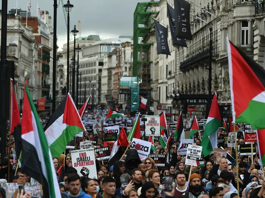 وشارك نحو 100 ألف شخص في مظاهرة لدعم القضية الفلسطينية بوسط لندن، السبت، جابت أنحاء العاصمة البريطانية للمطالبة بالوقف الفوري لإطلاق النار في غزة التي تتعرض للقصف منذ الهجوم الي شنته حركة "حماس" على إسرائيل قبل أسبوعين.