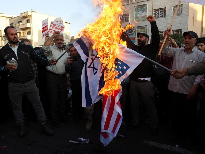متظاهرون في العاصمة الإيرانية طهران يحرقون علمي إسرائيل والولايات المتحدة احتجاجاً على حرب غزة. 18 أكتوبر 2023 - Reuters