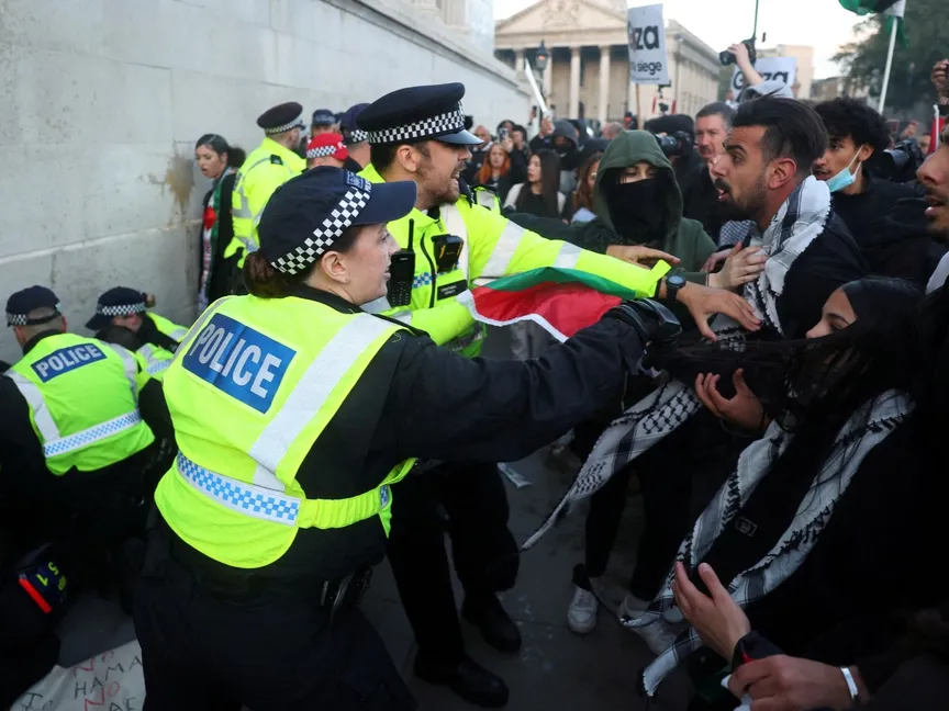 ضباط الشرطة يشتبكون مع المتظاهرين أثناء احتجاجهم تضامناً مع الفلسطينيين، في لندن، بريطانيا، 14 أكتوبر 2023 - REUTERS