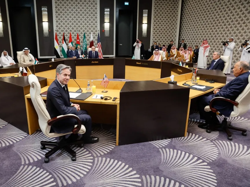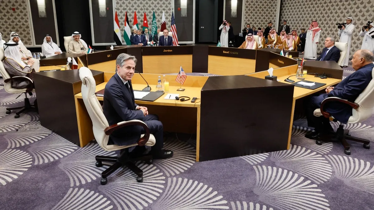 واجتمع وزراء خارجية مصر والسعودية والإمارات وقطر والأردن وأمين سر اللجنة التنفيذية لمنظمة التحرير الفلسطينية مع وزير الخارجية الأميركي أنتوني بلينكن، للتأكيد على الموقف العربي الداعي لوقف فوري لإطلاق النار وإيصال المساعدات الإنسانية بشكل فوري وعاجل لقطاع غزة.