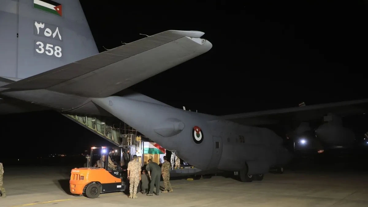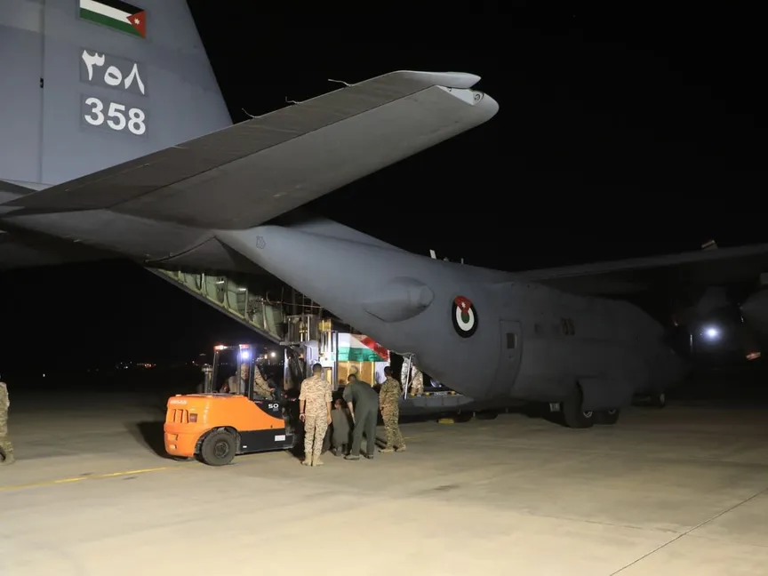 وذكر مصدر عسكري مسؤول في القيادة العامة للقوات المسلحة الأردنية، في تصريحات لوكالة الأنباء الأردنية الرسمية "بترا"، أن طائرة تابعة لسلاح الجو الملكي أنزلت مساعدات طبية عاجلة في ساعات الليل بواسطة مظلات للمستشفى الميداني الأردني "غزة/76".