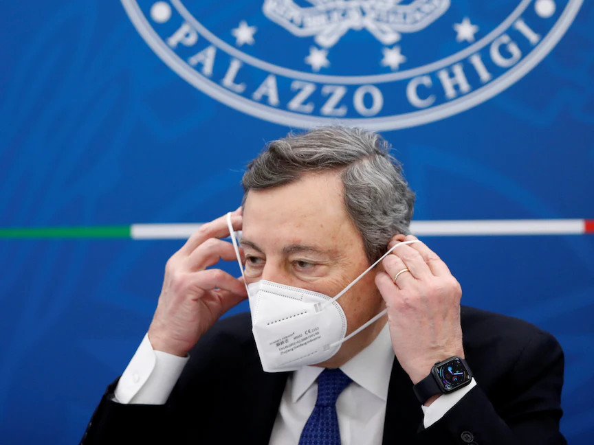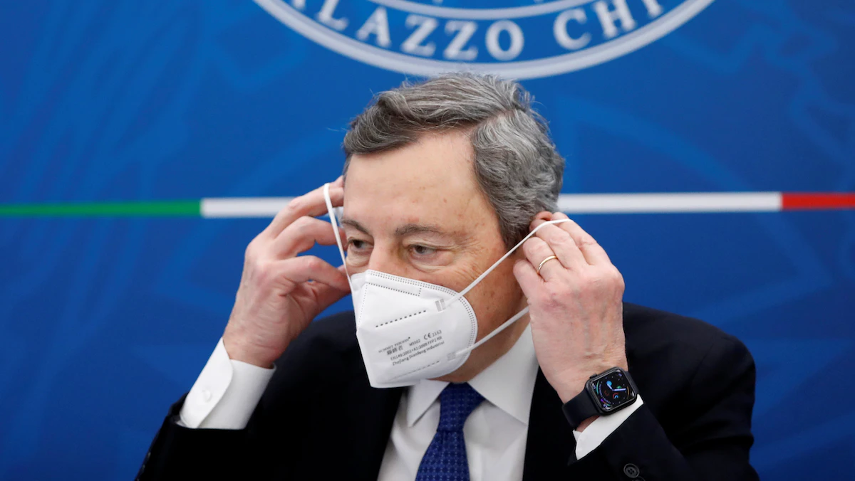 رئيس الوزراء الإيطالي ماريو دراغي خلال مؤتمر صحافي في روما - 26 مارس 2021 - POOL