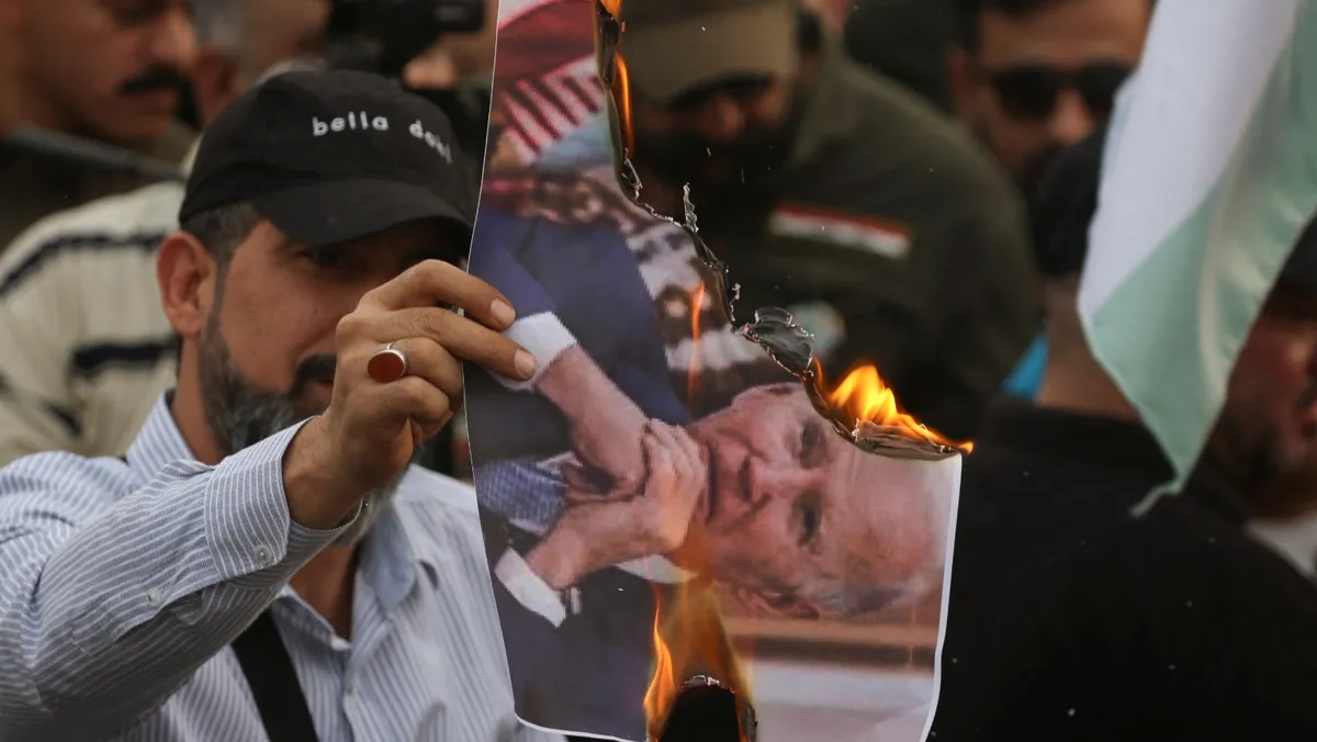 متظاهر يحرق صورة الرئيس الأميركي جو بايدن بالقرب من مدخل المنطقة الخضراء في بغداد. 20 أكتوبر 2023 - Reuters