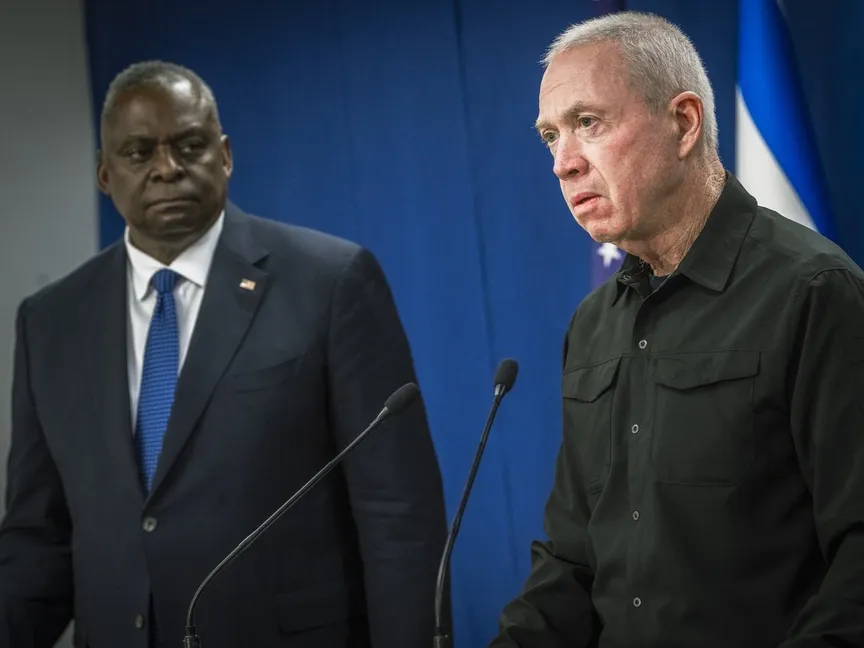 وزير الدفاع الأميركي لويد أوستن خلال مؤتمر صحافي مع نظيره الإسرائيلي يوآف جالانت في تل أبيب. 13 أكتوبر 2023 - AFP