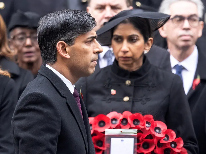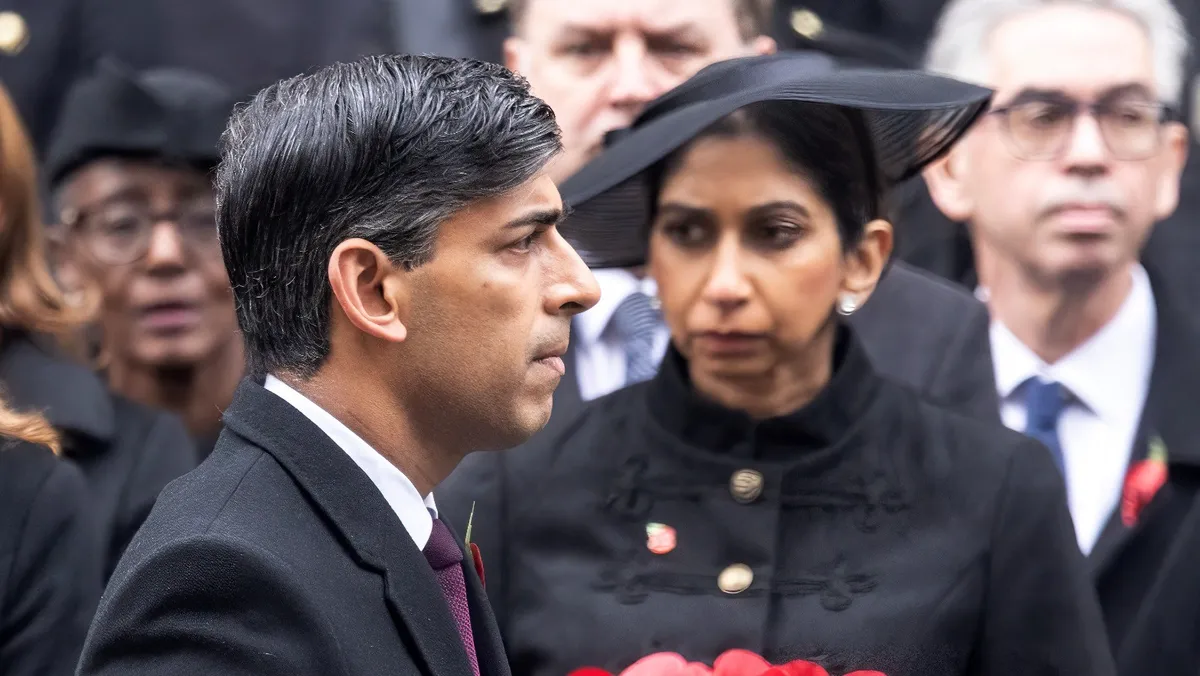 رئيس الوزراء البريطاني ريشي سوناك قرب وزيرة الداخلية البريطانية المقالة سويلا برافرمان خلال حدث في لندن. 12 نوفمبر 2023 - Reuters
