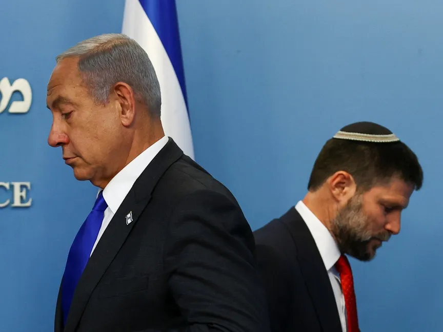 رئيس الوزراء الإسرائيلي بنيامين نتنياهو ووزير المالية بتسلئيل سموتريتش خلال مؤتمر صحافي في القدس. 11 يناير 2023 - Reuters