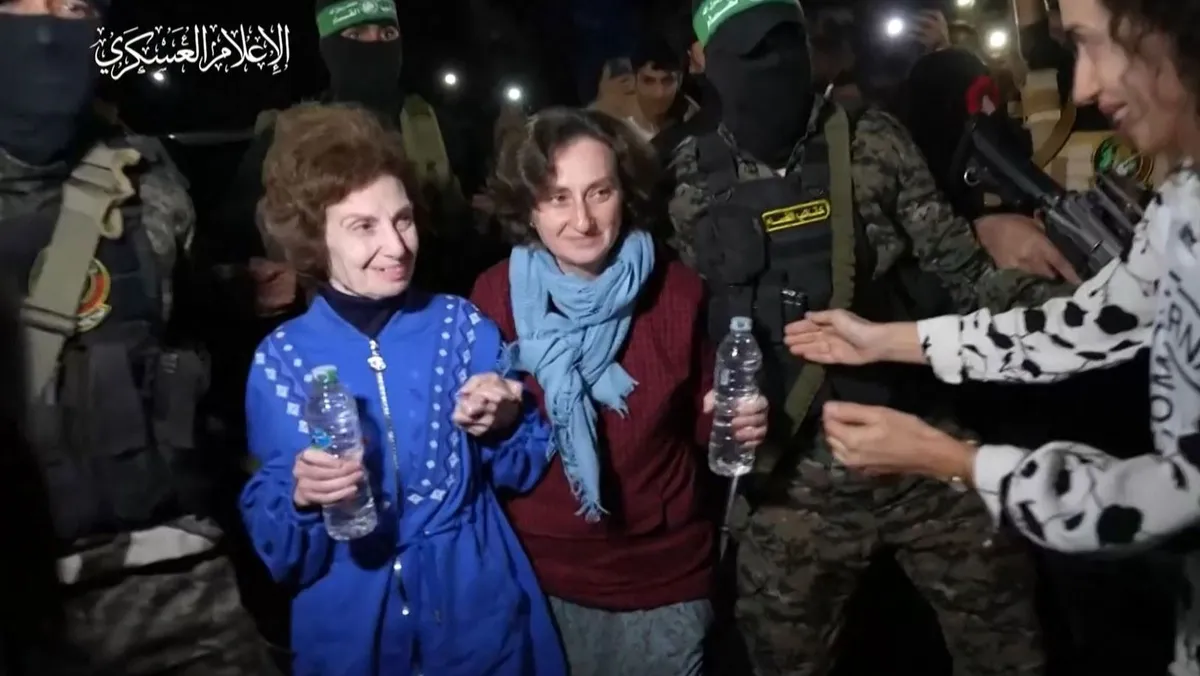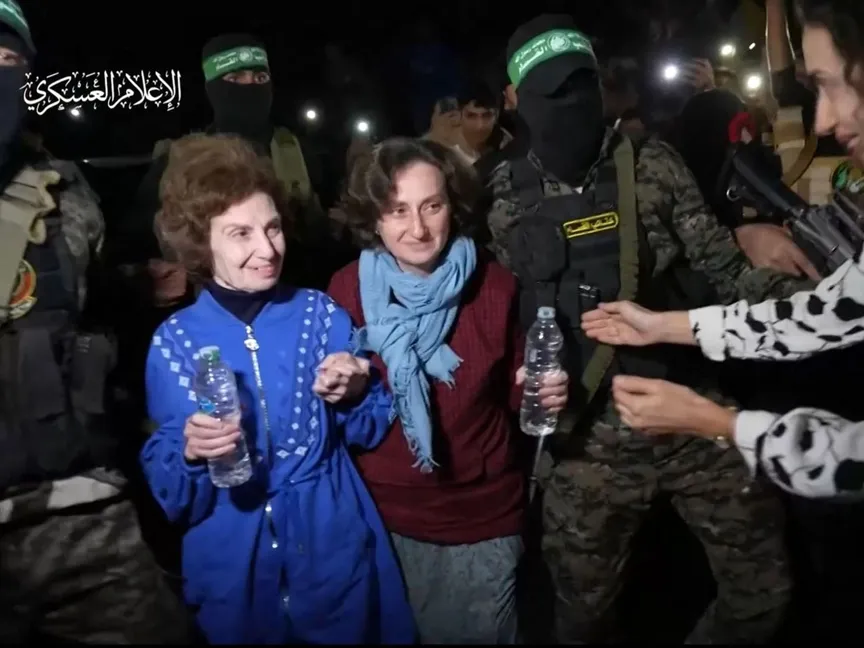 صورة مأخوذة من مقطع فيديو نشره المكتب الإعلامي لحماس تظهر مقاتلي الحركة يسلمون محتجزتين إسرائيلتين-روسيتين تم إطلاق سراحهم حديثاً إلى الصليب الأحمر في قطاع غزة. 29 نوفمبر 2023-