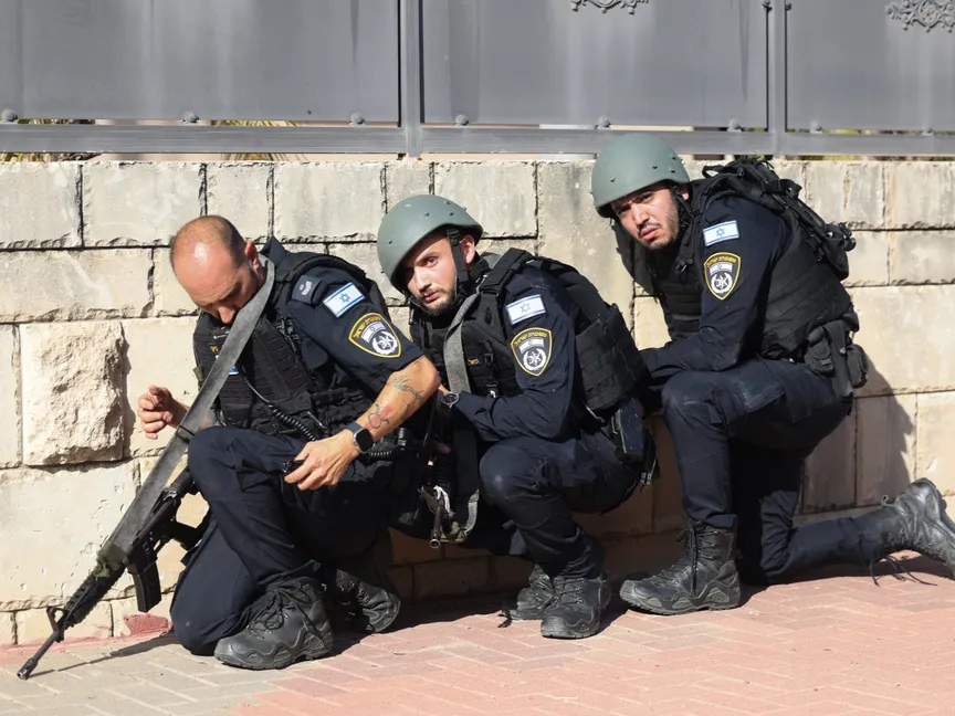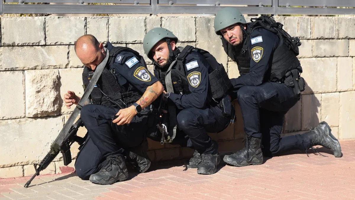 قوات إسرائيلية تحتمي خلف أحد الأسوار في شوارع عسقلان خلال هجوم حماس في 7 أكتوبر 2023 - AFP