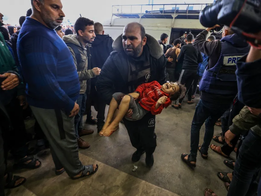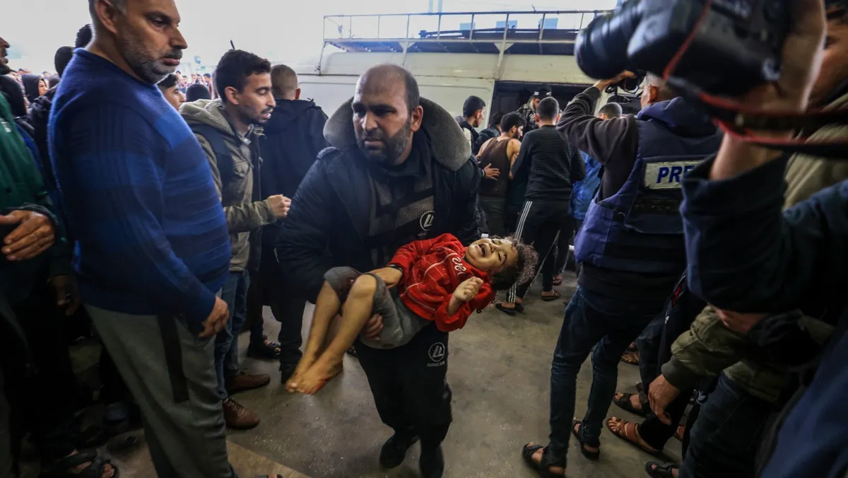 نقل طفل فلسطيني أصيب أثناء القصف الإسرائيلي إلى داخل مستشفى ناصر في خان يونس جنوب قطاع غزة. 5 ديسمبر 2023 - AFP