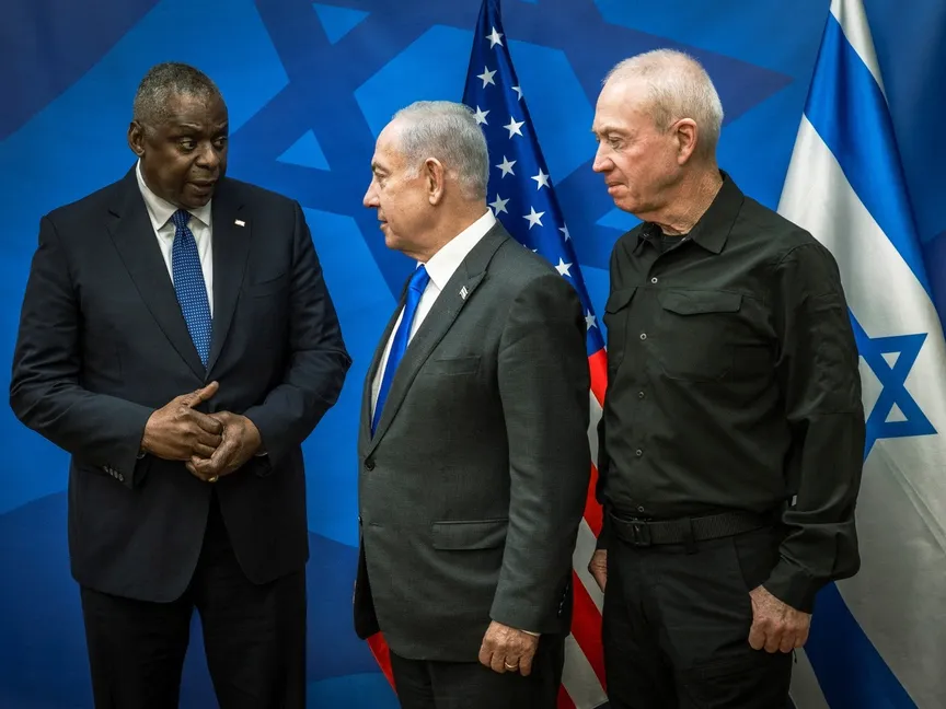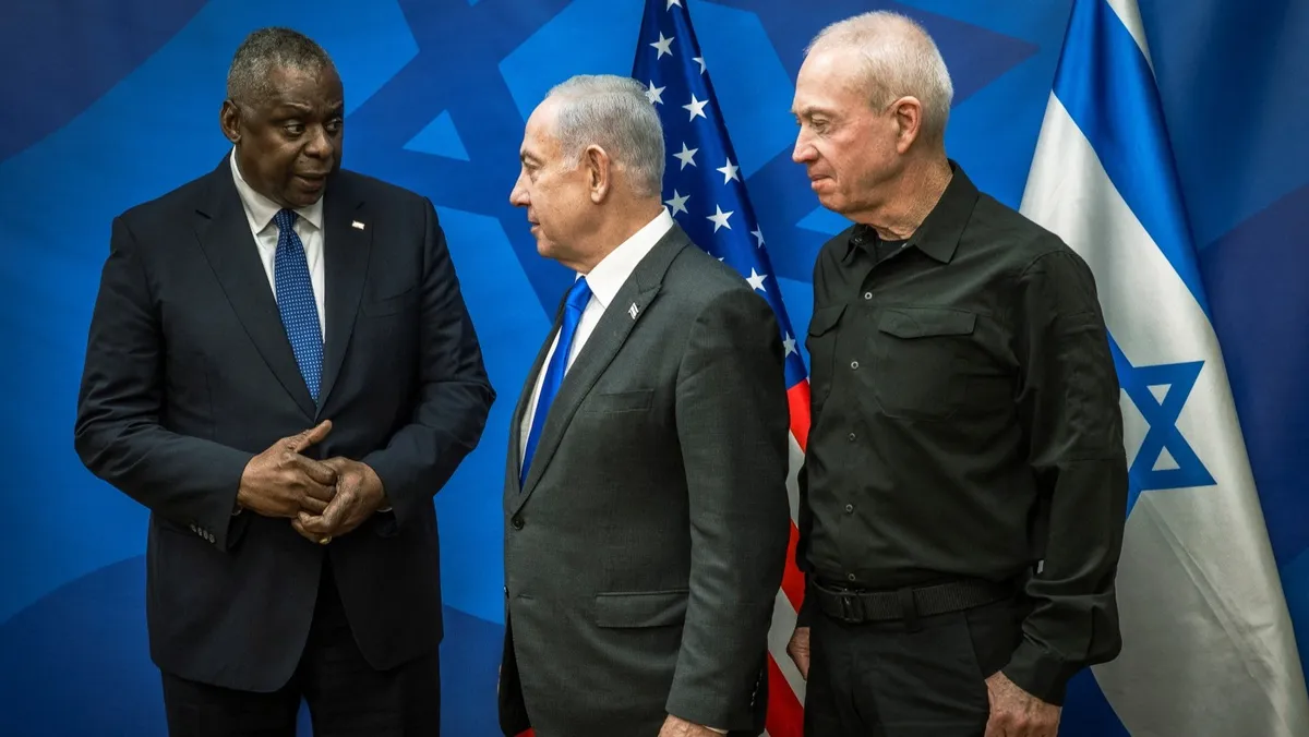 وزير الدفاع الأميركي لويد أوستن يتحدث إلى رئيس الوزراء الإسرائيلي بنيامين نتنياهو ونظيره الإسرائيلي يوآف جالانت في تل أبيب. 13 أكتوبر 2023 - Reuters