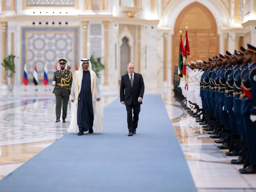 واستقبل الرئيس الإماراتي نظيره الروسي، الأربعاء، وجرت له "مراسم استقبال رسمية لدى وصول موكبه إلى قصر الوطن في العاصمة أبوظبي، فيما رافق موكبه ثلة من الفرسان على صهوات الخيول العربية"، بحسب وكالة الأنباء الإماراتية (وام).