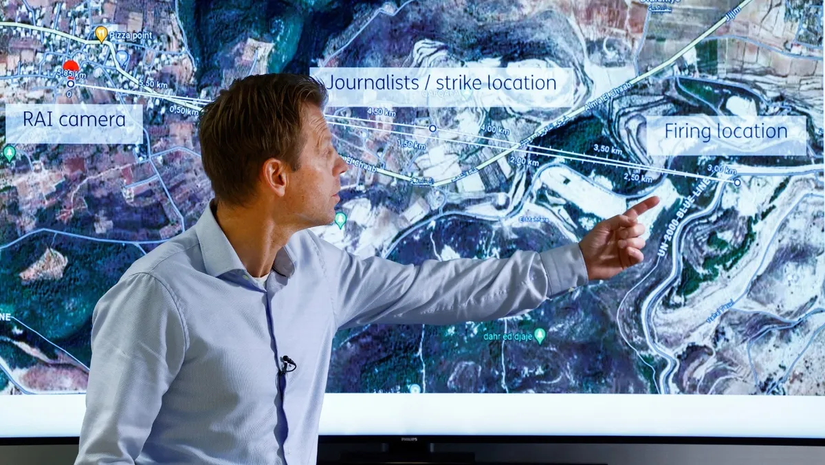 إريك كرون من المنظمة الهولندية للبحث العلمي التطبيقي (TNO) أمام خريطة توضح موقع الصحافيين الذين استهدفوا بقذيفة إسرائيلية على الحدود اللبنانية، لاهاي. 6 ديسمبر 2023 - Reuters