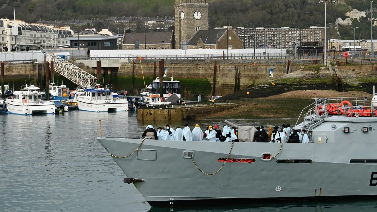 مهاجرون في ميناء دوفر بعدما ألقى حرس الحدود البريطاني القبض عليهم. 14 أبريل 2022 - AFP