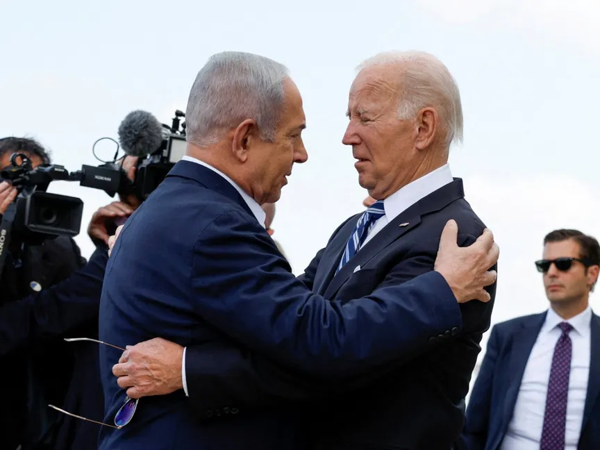 رئيس الوزراء الإسرائيلي بنيامين نتنياهو يرحب بالرئيس الأميركي جو بايدن لدى وصول الأخير إلى تل أبيب. 18 أكتوبر 2023 - Reuters