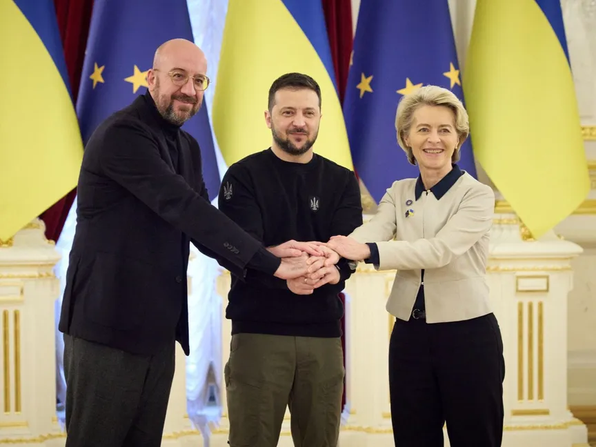 الرئيس الأوكراني فولوديمير زيلينسكي بين رئيسة المفوضية الأوروبية أورسولا فون دير لاين ورئيس المجلس الأوروبي شارل ميشيل في العاصمة الأوكرانية كييف. 3 فبراير 2023 - REUTERS