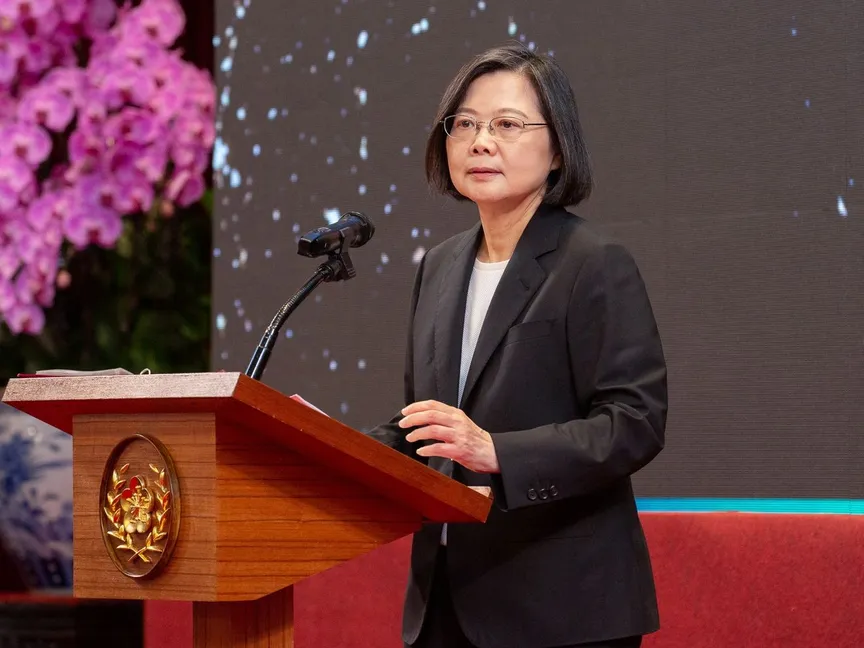 رئيسة تايوان تساي إينج وين تلقي كلمة في الذكرى السنوية السابعة لتوليها منصبها، القصر الرئاسي في تايبيه. 20 مايو 2023 - REUTERS