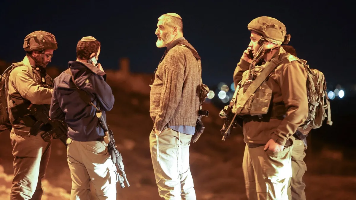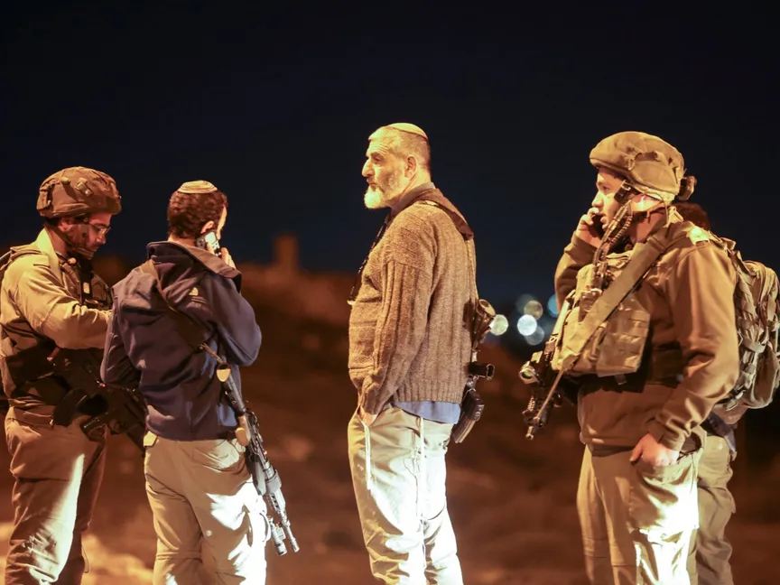 مستوطنون إسرائيليون مسلحون مع قوات إسرائيلية قرب مستوطنة في الخليل بالضفة الغربية المحتلة. 11 يناير 2023 - AFP