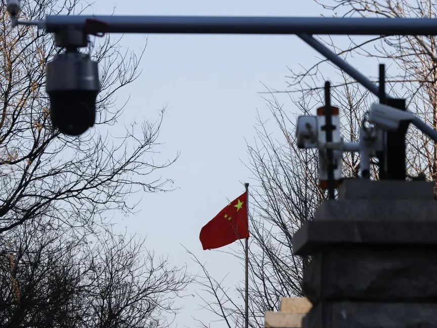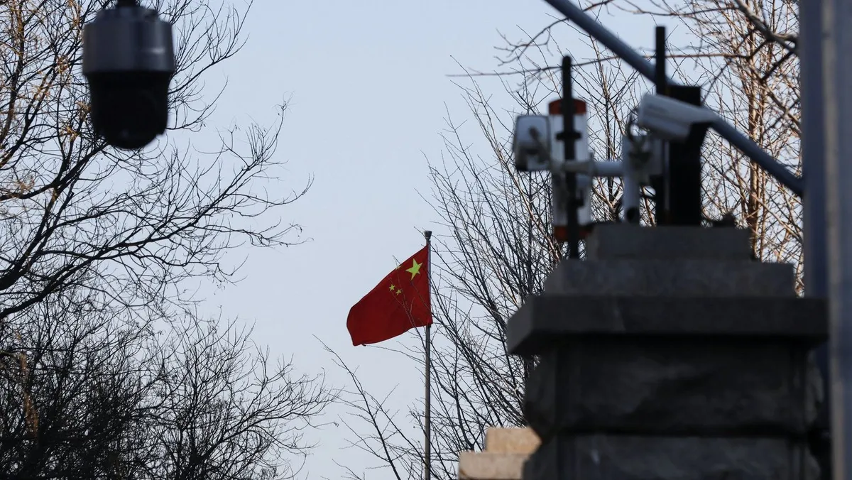 علم الصين بالقرب من كاميرات مراقبة خارج محكمة في العاصمة بكين. 31 مارس 2022 - REUTERS
