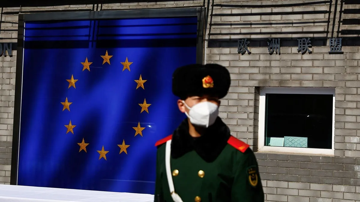 شرطي صيني يحرس مبنى بعثة الاتحاد الأوروبي في بكين، الصين. 24 فبراير 2023 - REUTERS