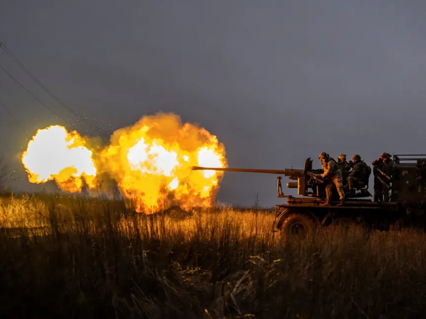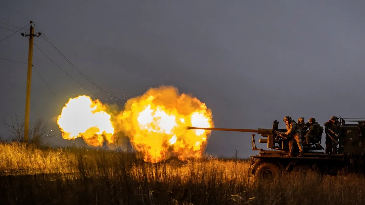 جنود أوكرانيون يطلقون قذيفة مدفعية تجاه القوات الروسية في مدينة باخموت. 21 ديسمبر 2023 - Reuters