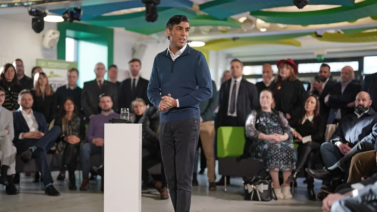 رئيس الوزراء البريطاني ريشي سوناك يتحدث خلال زيارة لمركز MyPlace للشباب في مانسفيلد. 4 يناير 2024 - AFP