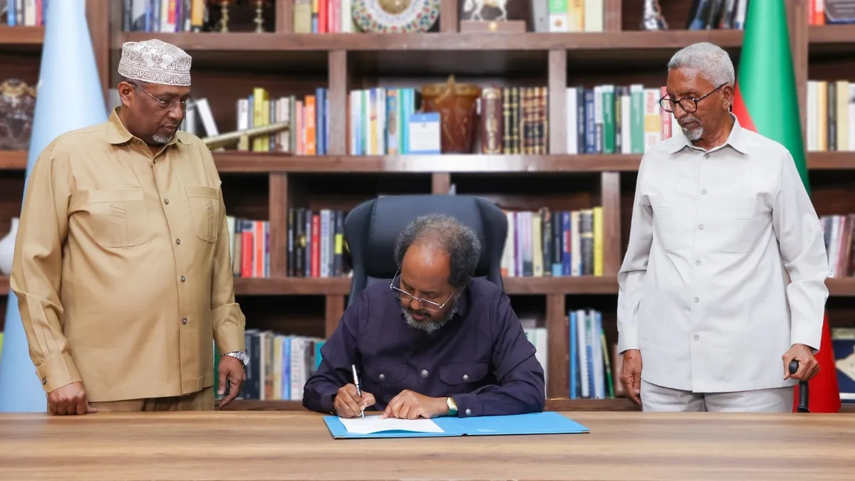 أعلن الرئيس الصومالي حسن شيخ محمود، السبت، أنه وقع قانوناً يُبطل مذكرة التفاهم المثيرة للجدل التي أبرمتها منطقة أرض الصومال الانفصالية وإثيوبيا مؤخراً.