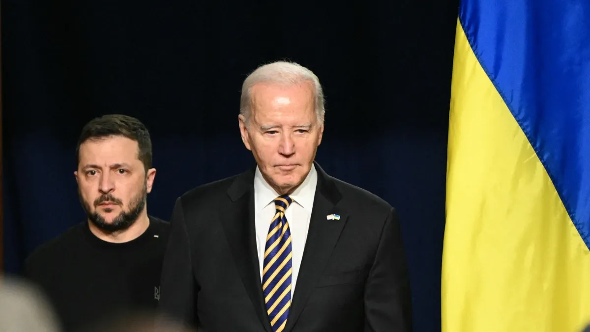 الرئيس الأميركي جو بايدن إلى جانب نظيره الأوكراني فولوديمير زلينسكي خلال مؤتمر صحفي. واشنطن، الولايات المتحدة. 12 ديسمبر 2023 - AFP