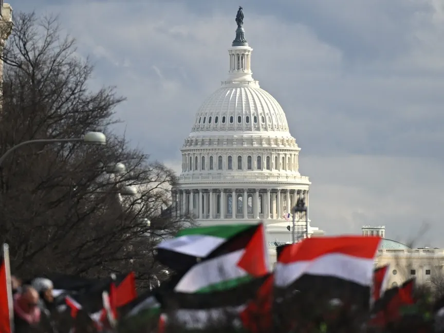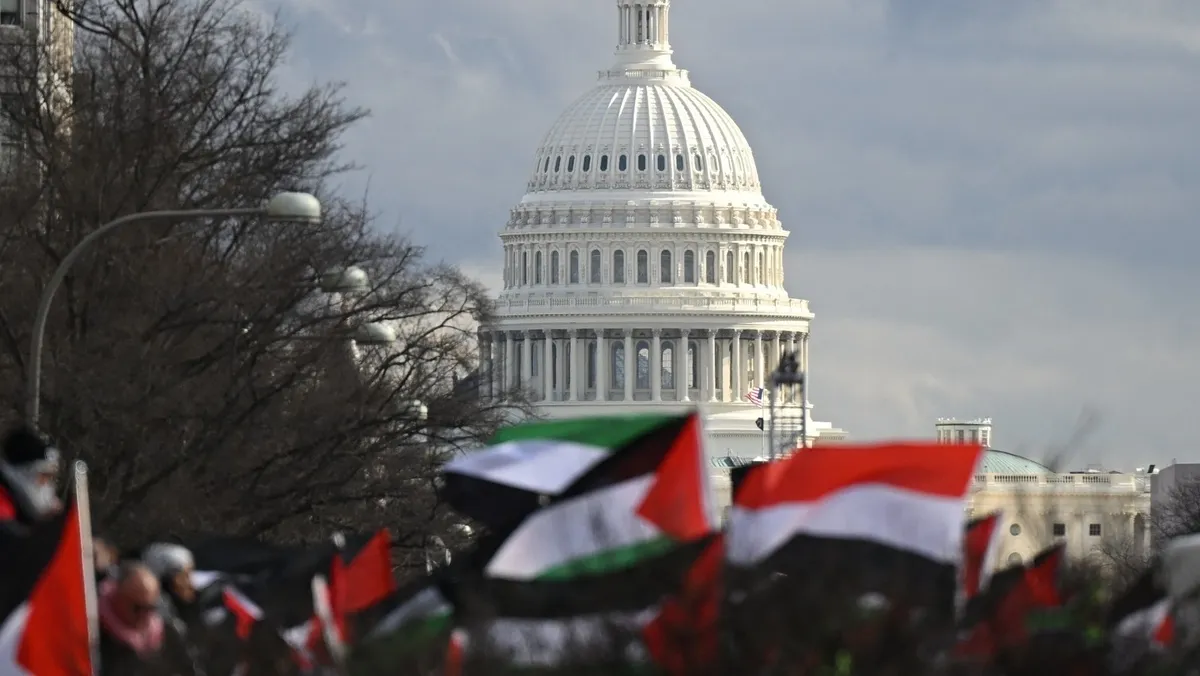 وفي واشنطن، لوحت حشود كبيرة بالأعلام الفلسطينية، بينما تجمع المتظاهرون ومعظمهم من الشباب - ارتدى العديد منهم الكوفية - في مسيرة تضامنية في اليوم التاسع والتسعين من حرب إسرائيل على قطاع غزة.