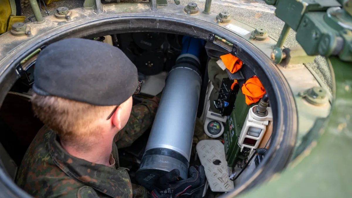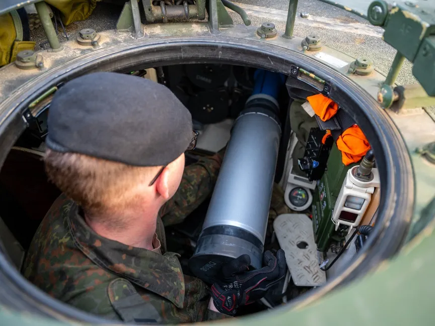 جندي في الجيش الألماني يقوم بتحميل قذيفة من عيار 120 ملم لإجراء تداريب. بيرجن، ألمانيا، 28 سبتمبر 2023 - AFP