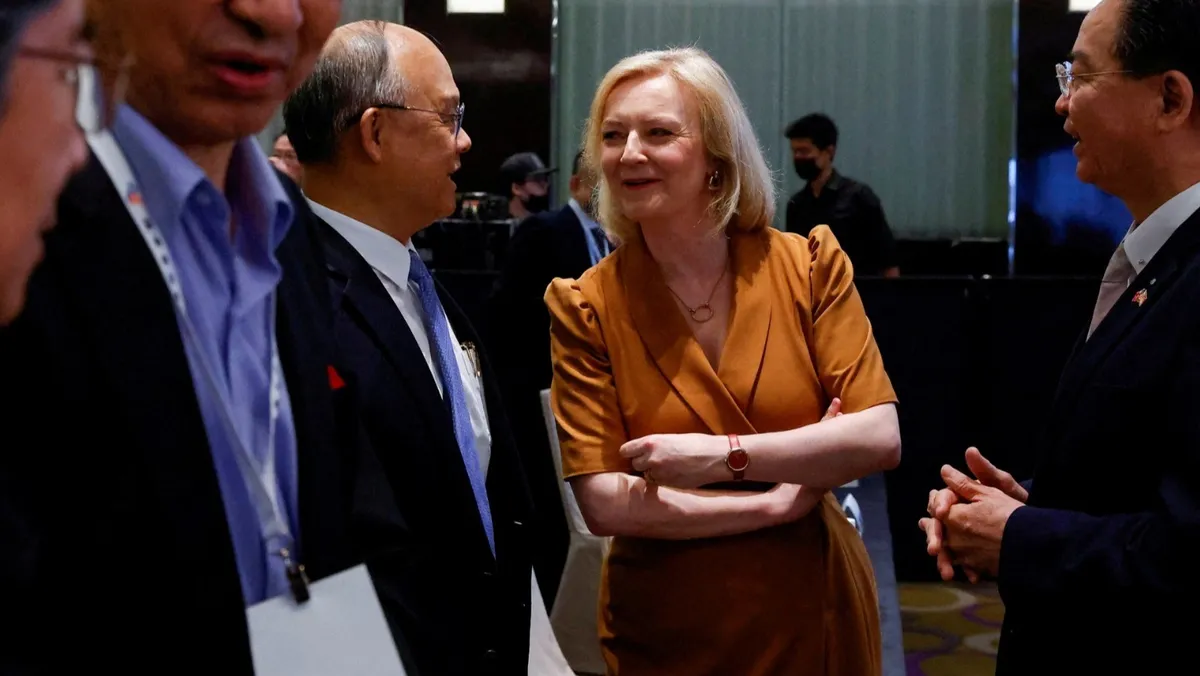 رئيسة الوزراء البريطانية السابقة ليز ترس في حديث من مسؤولين تايوانيين في العاصمة تايبيه. 17 مايو 2023 - REUTERS