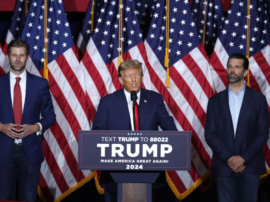 الرئيس الأميركي السابق دونالد ترمب يتوسط  نجليه إريك ترمب ودونالد ترمب جونيور، خلال كلمة في ولاية أيوا. 15 يناير 2024 - Getty Images via AFP