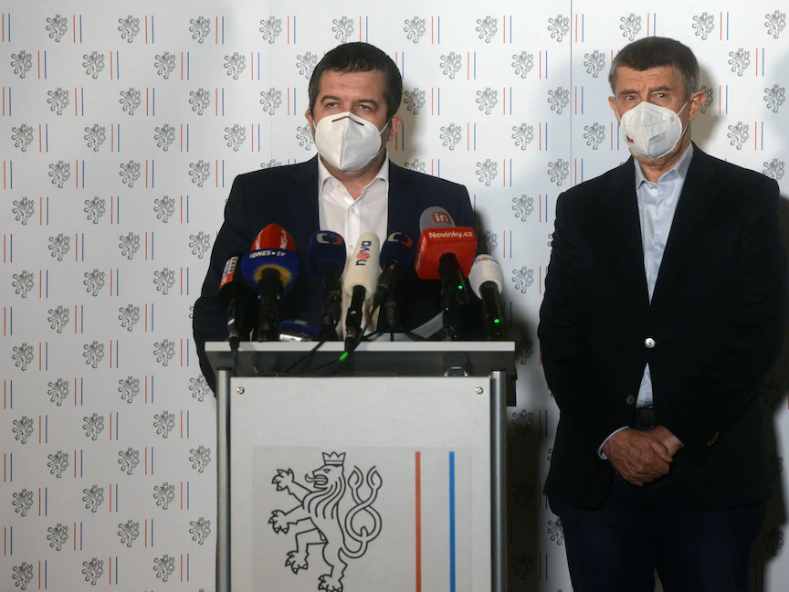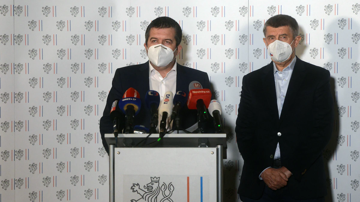 رئيس الوزراء التشيكي أندريه بابيس (يمين) ووزير الخارجية والداخلية التشيكي يان هامسيك خلال المؤتمر الصحافي -17 أبريل 2021 - AFP