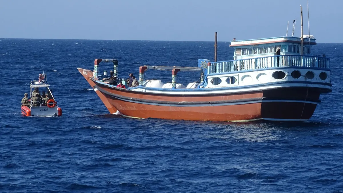 جنود من البحرية الأميركية يحيطون بسفينة قالت القيادة المركزية الأميركية إنها كانت تهرب أسلحة إلى الحوثيين من إيران. 18 يناير 2024 - twitter.com/CMF_Bahrain