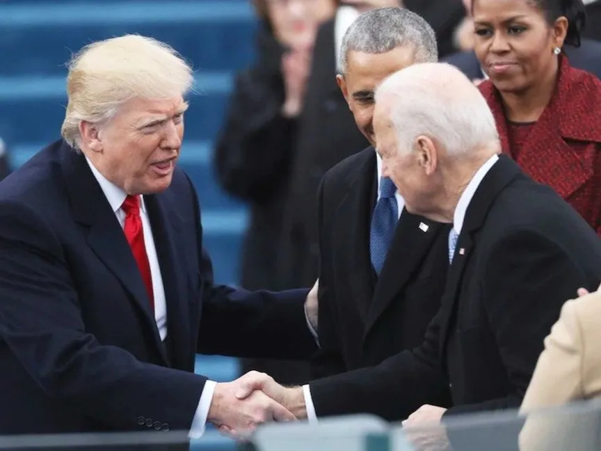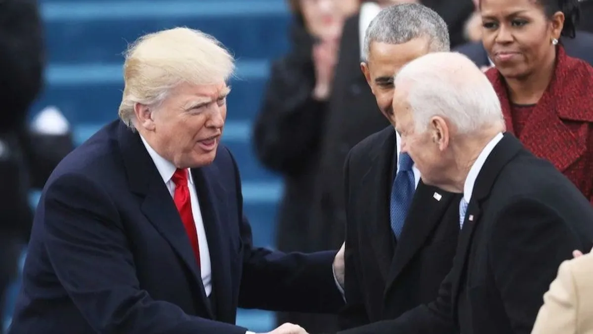 الرئيس الأميركي (الحالي) جو بايدن يهنئ الرئيس (السابق) دونالد ترمب بعد فوزه في انتخابات الرئاسة في عام 2016. 20 يناير 2017 - REUTERS