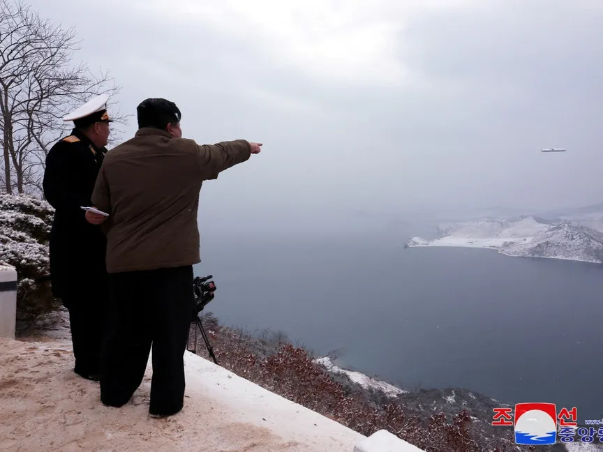 الزعيم الكوري الشمالي كيم جونج أون يحضر اختبار صاروخ كروز تم إطلاقه من غواصة في مكان غير معلوم في كوريا الشمالية في هذه الصورة التي نشرتها وكالة الأنباء المركزية الكورية. 28 يناير 2024 - Reuters
