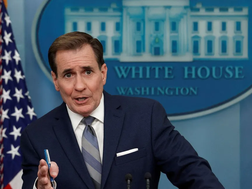 منسق الاتصالات الاستراتيجية بمجلس الأمن القومي الأميركي في البيت الأبيض جون كيربي خلال مؤتمر صحافي في البيت الأبيض. 01 مايو 2023 - REUTERS