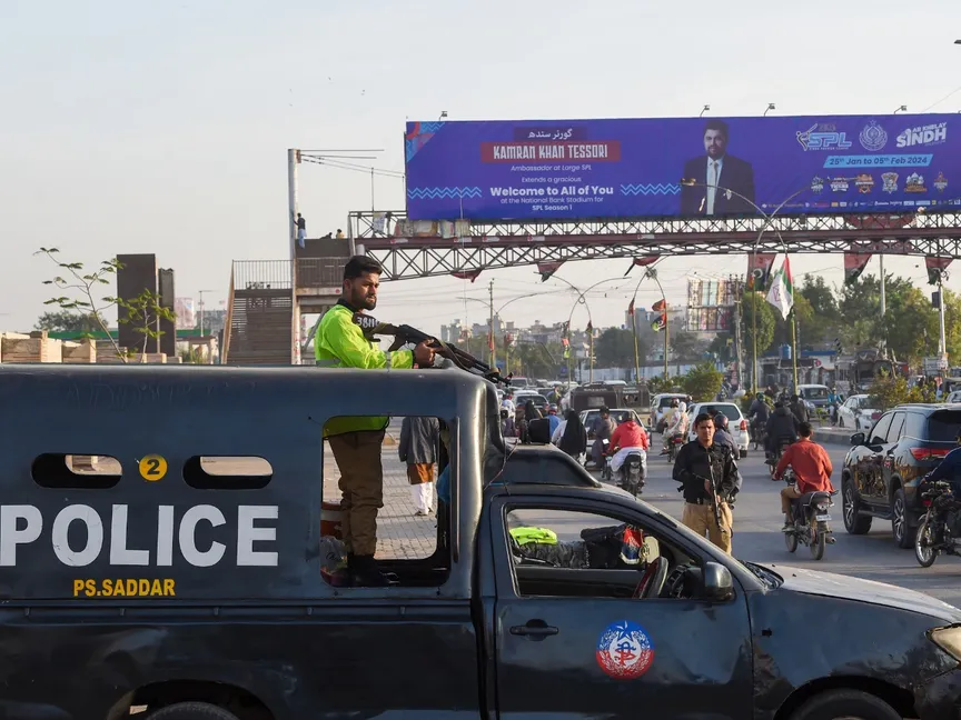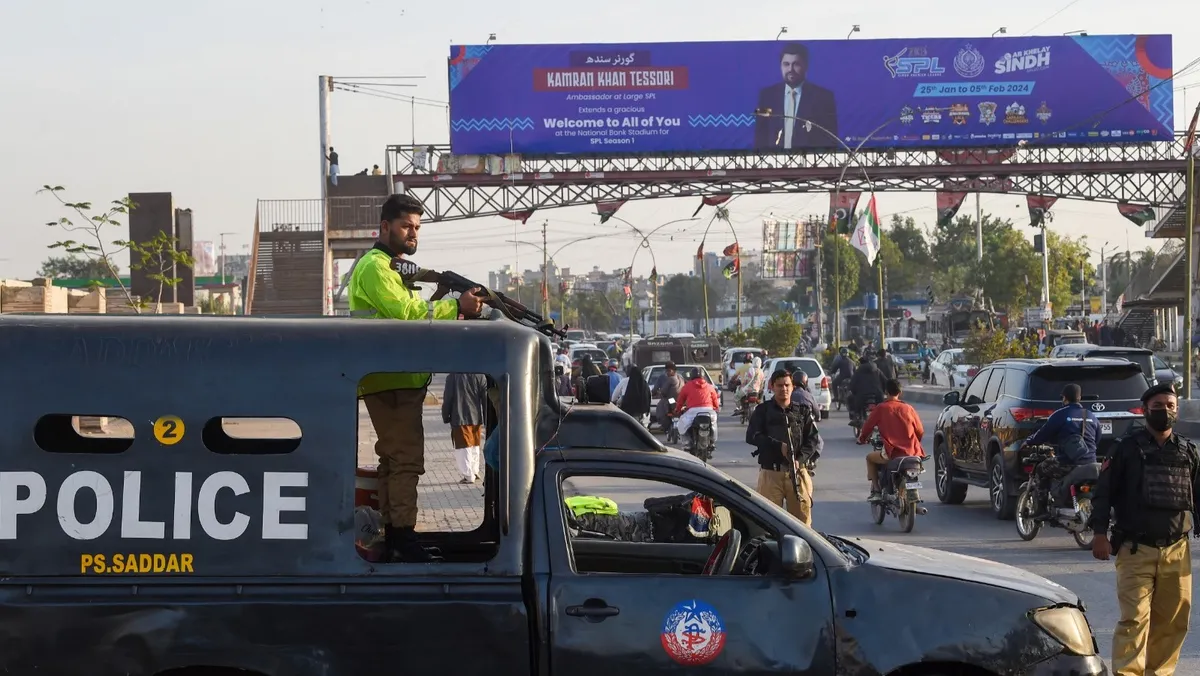 رجال شرطة يقفون للحراسة على طول أحد شوارع كراتشي قبل الانتخابات العامة. 1 فبراير 2024 - AFP