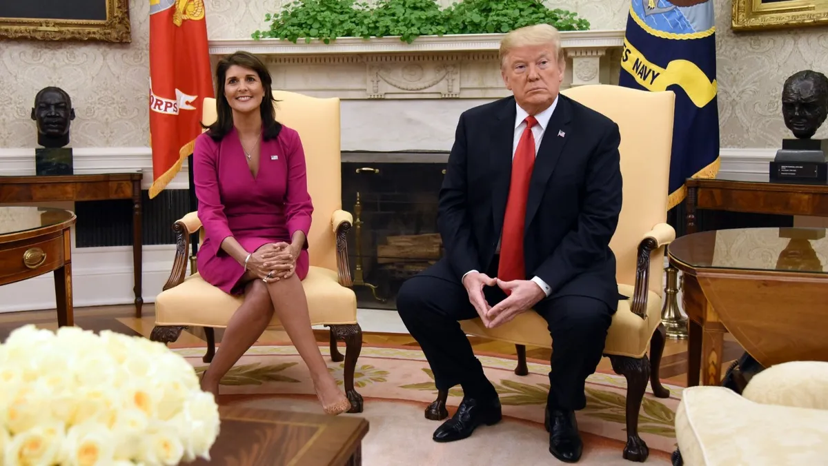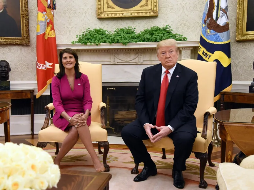 لكن بعد وصول ترمب إلى البيت الأبيض، وتولي هيلي منصب سفيرة الولايات المتحدة لدى الأمم المتحدة، تراجعت هيلي عن تلك الآراء، وبدا التحالف بينها وبين الرئيس السابق جلياً للجميع. ثم بعد عامين فقط من عملها سفيرة الولايات المتحدة، استقالت هيلي من منصبها دون إثارة أي متاعب مع ترمب.