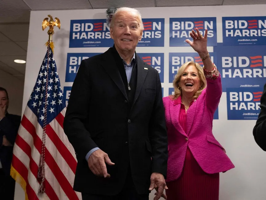 الرئيس الأميركي جو بايدن وزوجته جيل، داخل مقر حملته الانتخابية في ديلاور. 03 فبراير 2024 - AFP